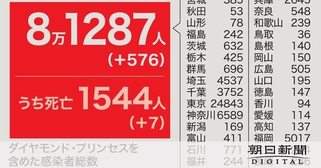 新型コロナウイルスの国内の感染者は25日午後9時半現在で、新たに576人が確認された。感染者数が全国最多の東京都では、24日と同じく195人の感染が確認された。栃木県と兵庫県で、前日までに発表された感染者数を1人減らす修正があった。死者は全国で7人。そのうち4人は東京で50~90代の男女だった。