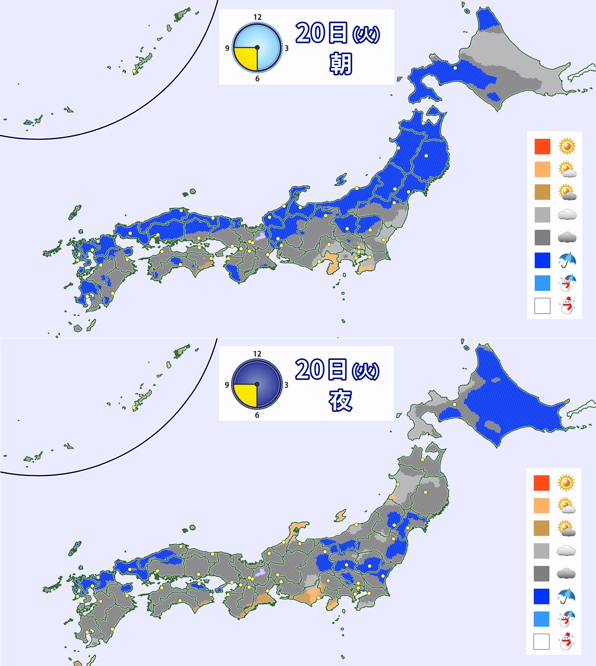 きょう20日(火)は全国的に雨や雷雨となり、非常に激しく降る所がありそうだ。土砂災害や河川の増水、低い土地の浸水、落雷、突風などに注意・警戒が必要となる。また、北日本の太平洋側では気温があまり上がらず、10月並みの涼しさの所もありそうだ。