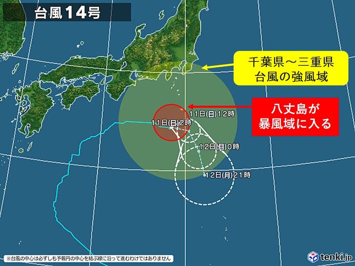 台風14号は、11日午前2時現在、八丈島の南南西約140kmの海上を東に進んでおり、伊豆諸島南部の八丈島が台風の暴風域に入りました。
