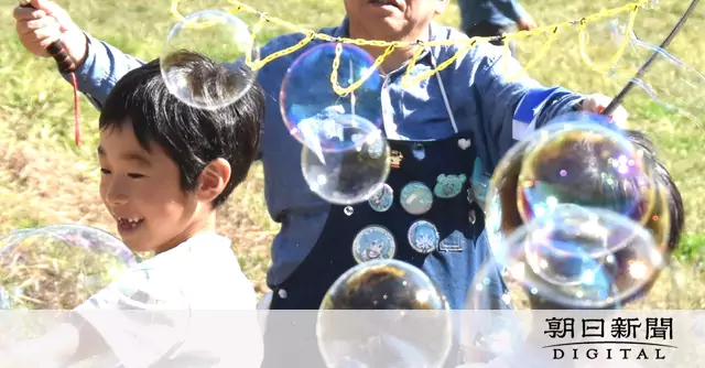 子どもたちは無数の小さなシャボン玉を追いかけ、人が入れそうなほどの大きなシャボン玉には精いっぱい手を伸ばして触ろうとする。「金ちゃん」こと金川佳史さん(58)が開く「冒険シャボン玉」の会場は、歓声であふれている。