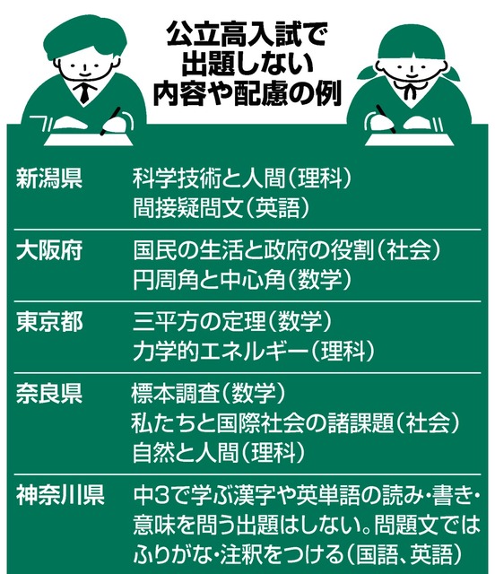 範囲を縮小するのは、感染者が多く、休校期間が長かった首都圏や大阪を含む6都府県。数学の「三平方の定理」(東京、大阪)▽中3の国語で学ぶ漢字(東京、神奈川)▽英語の「主語+動詞+whatなどで始まる間接疑問文」(新潟)などが、出題範囲から外される。ただ、いずれの自治体も、中学卒業までには全ての学習内容を終えるとしている。