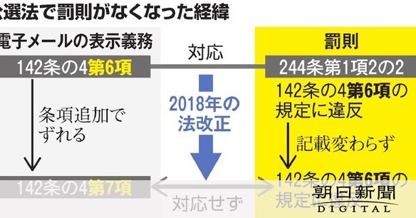 罰則がなくなったのは公選法の「142条の4第7項」。候補者や政党が選挙に際して投票依頼などの電子メールを送る際に、送信者名や、受信拒否を希望する場合の連絡先などを表示するよう義務づける規定だ。