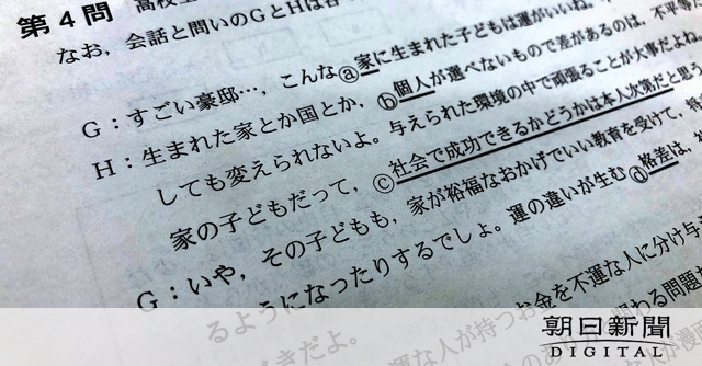 親の資力で将来が決まると嘆く「親ガチャ」を想起させる問題も、2科目で出された。