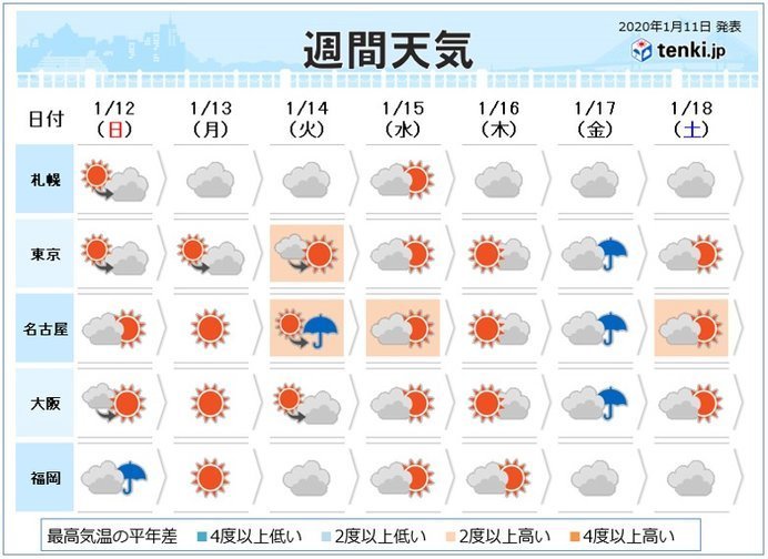 その後も天気は短い周期で変わります。14日(火)は太平洋側は雨マークのない所でもあちらこちらで雨、17日(金)は太平洋側で広く雨になるでしょう。一方、例年、この時期は雪マークがずらりと並ぶ札幌は曇り空の日が多い予想です。