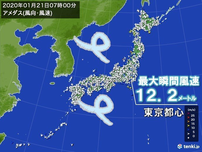 21日(火)は、日本付近は冬型の気圧配置になっており、広く北風が吹いています。東京都心でも朝に最大瞬間風速12.2メートルを観測しました。