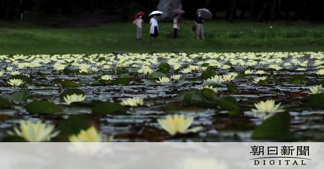 宮崎市阿波岐原町の「市民の森」内にある御池(みいけ)で、淡い黄色のスイレンが見頃を迎え、水面全体を鮮やかに彩っている。