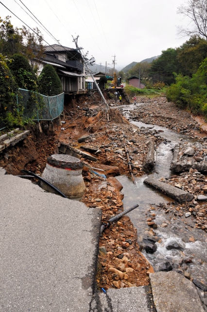 12日は、午前中から激しい雨が降っていた。自宅の前を走る道路は細く、脇を流れる千曲川の支流・谷川(やがわ)は増水していた。家の玄関周りに水が流れ込むのを防ごうと、三石さん夫妻は同居する息子らと土囊(どのう)やコンクリートのブロックを積んでいた。