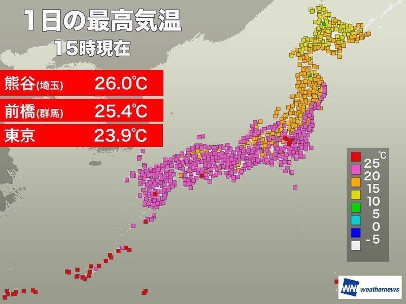 15時までの最高気温を見ると、南西諸島や小笠原諸島などの島しょ部を除いて一番気温が高くなったのは群馬県の伊勢崎と熊谷で、いずれも26.0℃まで上がりました。