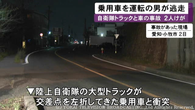 愛知県小牧市の交差点で2日朝、自衛隊の大型トラックと乗用車が衝突し2人がケガをしました。乗用車を運転していた男は現場から立ち去っていて、警察が行方を追っています。