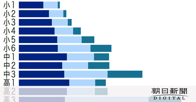 22年調査では、小学1年が1日平均42分、6年が1時間34分でした。小学校では1学年上がるごとに約10分増えた計算になります。中学1、2年、高校1、2年は1時間30分程度、受験がある中学3年、高校3年はそれぞれ2時間6分と2時間45分でした。