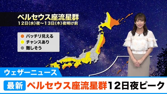 現在、3大流星群の一つである、ペルセウス座流星群が活動期を迎えています。 活動のピークは12日(水)の22時頃と予想されているため、観測には12日(水)深夜~13日(木)夜明け前の時間帯がオススメです。 いつもより短い夏休みの思い出の一つとして、少し夜更ししてご家族一緒に夜空を見上げてみてはいかがでしょうか。