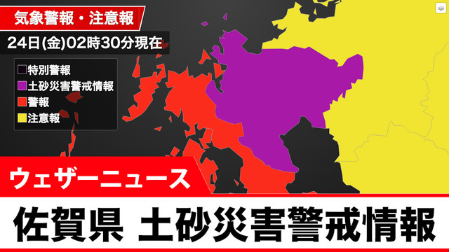 7月24日(金) 2時20分佐賀県に土砂災害警戒情報が発表されました。降り続く大雨のため、土砂災害警戒区域等では命に危険が及ぶ土砂災害がいつ発生してもおかしくない非常に危険な状況です。崖の近くや谷の出口など土砂災害警戒区域等にお住まいの方は、市町から発令される避難勧告などの情報に留意し、少しでも安全な場所への速やかな避難を心がけてください。