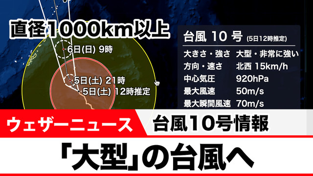 非常に強い台風第10号は、11時現在「大型」で非常に強い台風に変わり、南大東島の南南東約190キロを1時間におよそ15キロの速さで北西へ進んでいます。 甚大な被害につながる危険性が高まります。最悪の事態に備え、早い内に台風への備えを行うようにしてください。