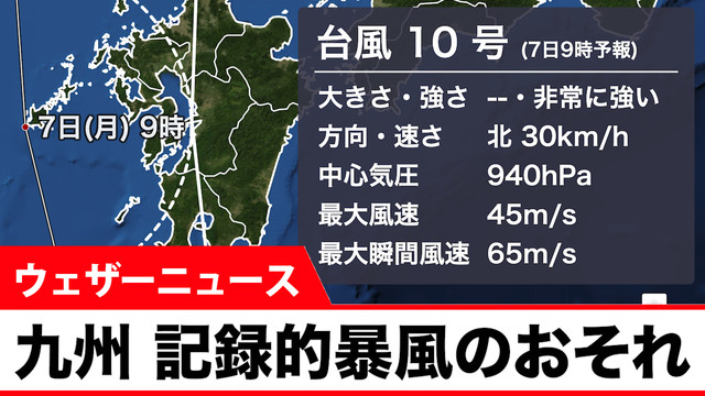 台風10号は予報円の中心を通った場合、九州の大部分が台風の暴風域に入る見込みです。接近時も中心付近の最大瞬間風速は60~70m/sを予想しています。一般に台風は進行方向の右側(10号の進路では東側)で風が強まる傾向があり、上陸しない場合でも九州では台風の進路に近い東シナ海側を中心に、記録的な暴風となるおそれがあります。