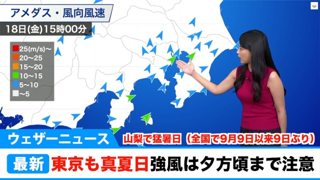 本州付近を南下中の秋雨前線や低気圧に向かって暖かな空気が流れ込み、関東は朝から気温が高くなっています。 また、暑さをもたらしている南風は南部を中心に強く吹いています。夕方までは風の強い状況が続きますので、車の運転時の横風や、飛来物などに注意をしてください。