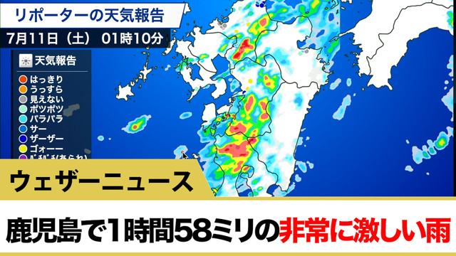 鹿児島さつま柏原では、1時20分までの1時間に58.0mmの非常に激しい雨を観測しました。この後も、九州では大気の状態が非常に不安定になり、線状降水帯が発生するおそれもあります。 これまでにすでにかなり雨量が多くなっている所がありますので、引き続き大雨による災害には厳重な警戒が必要です。