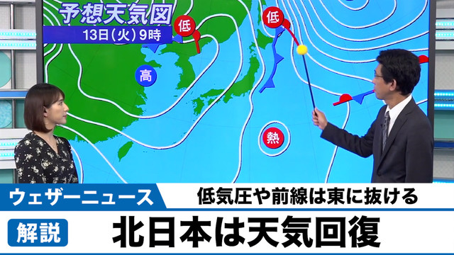 今日13日(火)は、低気圧や前線が東に抜け、北日本では天気が回復します。 太平洋側は午前中から晴れてくる見込みで、外出のタイミングで雨が止んでいれば、傘は必要ありません。 日本海側は雲が残るものの、午後は日差しの届くところがあります。