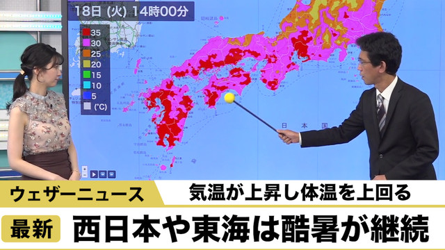 西日本から東海は、引き続き高気圧に覆われて、強い日差しが照りつけます。午前中から気温が高く、昼間は体温を大きく超えて40℃近い酷暑となるところがある見込みです。 熱中症の危険性の高い状況となりますので、こまめな水分補給や室内ではエアコンの使用など、万全の対策をお願いします。