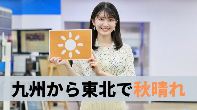 おはようございます。今日は九州から東北にかけて秋晴れが広がります。東北日本海側は雲が多い空ですが、次第に晴れていく見込みです。北海道は日本海側を中心にスッキリしない空に。強雨や雷雨、突風にご注意ください。昼間はカラッとした日差しの暑さも感じられ、朝晩との気温差が大きくなりそうです。日中の気温も確認し、調節しやすい服装でお出かけくださいね。