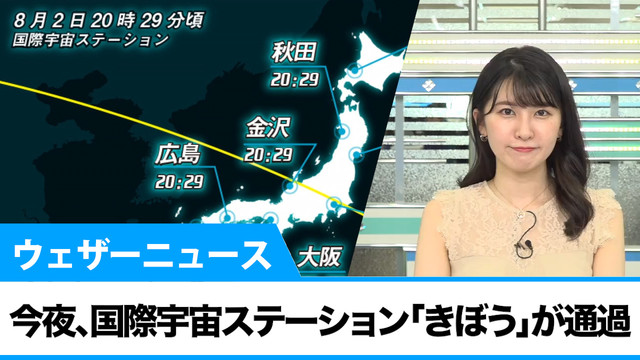 JAXA(宇宙航空研究開発機構)によると、8月2日(日)20時29分頃に、国際宇宙ステーション/きぼうが日本付近を通過します。遮る雲が無ければ、全国的に国際宇宙ステーション/きぼうを見るチャンスがありそうです。(通過時間は、多少前後する可能性がありますのでご了承ください。)
