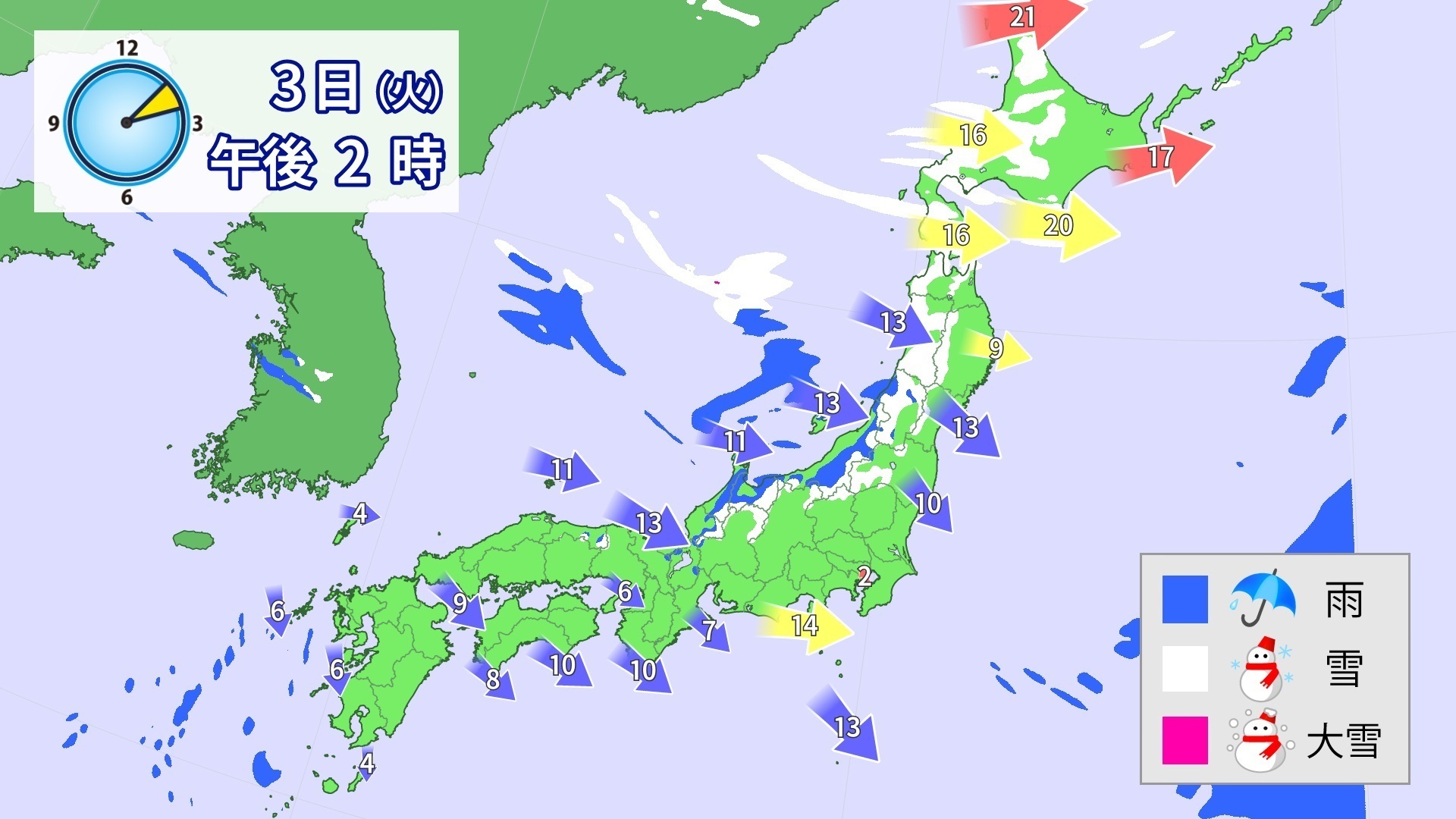 3日(火)は、北陸では冷たい雨や雪となり、北日本はふぶくところがある。太平洋側は天気が回復するが、冷たい北風が強く吹く見通しだ。