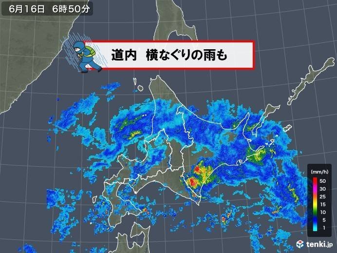今日は全道的に雨となり、道東では局地的に1時間に40ミリ、その他の地域でも30ミリと、激しい雨となる恐れがあります。大気の状態が不安定になっているため、雷雨となることもあるでしょう。午前6時の函館では、雷が観測されています。風を伴い、横なぐりの雨となることもありそうです。明日の明け方までの24時間に降る雨の量は、道東の多い所で100ミリ、その他の地域では90ミリに達するでしょう。局地的には6月の平年のひと月分に相当する雨が1,2日で降る可能性があります。土砂災害や低い土地の浸水、河川の増水などに注意して下さい。