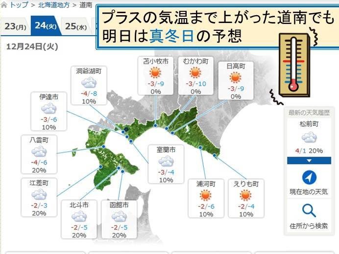 今日(23日)の北海道は、今シーズン一番低い最低気温を更新するなど冷え込みが強まり、日中でも気温が0度以下の地点が多くなっています。明日(24日)も寒さは続き、北海道のアメダス全地点で最高気温が0度未満の真冬日となるかもしれません。