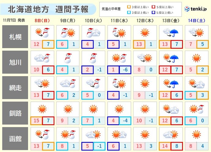 今日(7日)は立冬とは思えないほどの暖かさとなった北海道。午後3時までの道内の最高気温は、札幌市手稲山口で20.4度まで上がるなど、5地点で20度以上となりました。しかし、明日(8日)の午後以降は再び寒さが強まる見込みで、寒気のピークとなる来週の火曜日頃には、道内で真冬日となる所もありそうです。