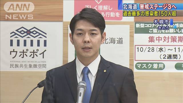 北海道では7日の感染者が150人を超えることが分かりました。北海道は午後にも警戒ステージを「3」に引き上げる方針です。 北海道・鈴木知事:「ステージ3への移行も含めて現在、専門家の方々などにも意見を聞いている。早ければあすの対策本部で決定したいと考えている」