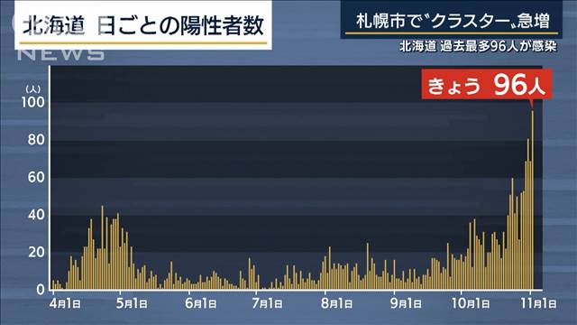 北海道で2日、96人の新型コロナウイルスの感染が確認され、一日あたりの人数としては過去最多となりました。北海道内では、特にこの1週間で急増しています。市中感染が広がっている状況も浮き彫りになりました。札幌市では4月は6件だったクラスターが、先月だけで21件、3倍以上になっています。