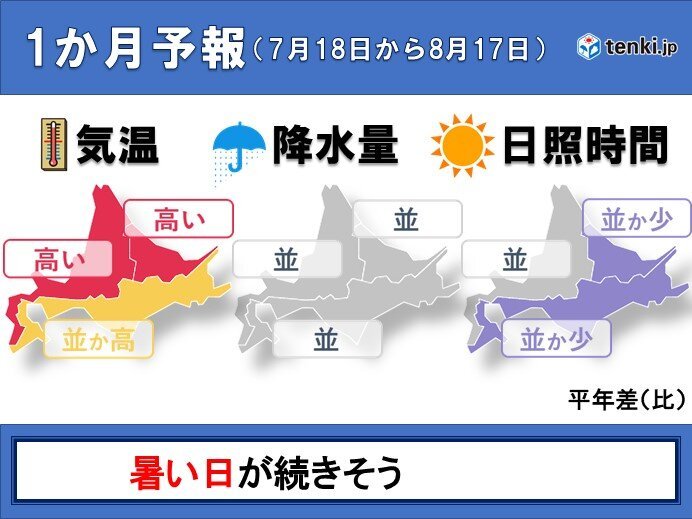大暑を迎えて一番暑い時期に入ることもあり、札幌では平年でも最高気温が26度から27度まで上がります。暑さ対策は引き続き必要となるでしょう。
