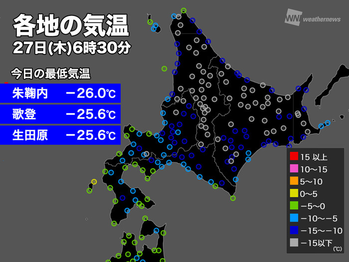 7時までの最低気温は、朱鞠内で-26.0℃、歌登と生田原で-25.6℃と、2月10日以来となる-25℃を下回る厳しい冷え込みとなりました。