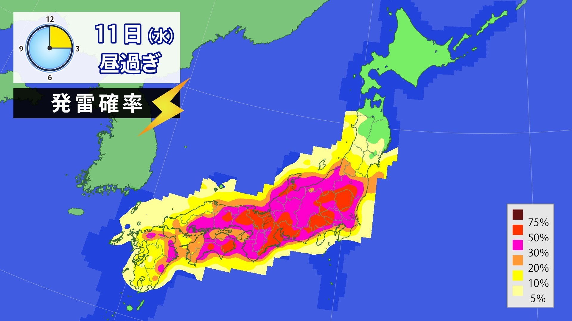 きょう11日(水)昼前から夜にかけて、北陸や東北、関東甲信で大気の状態が非常に不安定となり、雷を伴って非常に激しい雨の降る所がある見込み。