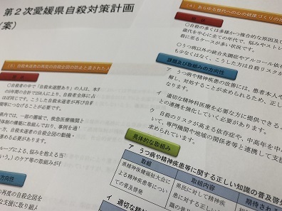 愛媛県は21日、「第2次愛媛県自殺対策計画」の案を公表した。40歳代から60歳代までを中心に全ての年代で「うつ病」を発症して自殺に至るケースが多いことや、統合失調症やアルコール依存症による自殺者数が少なくない状況にあることを指摘。適切な精神科医療を必要な人に提供できるよう、医療機関などの関係者との連携を強化する必要性を挙げている。【新井哉】