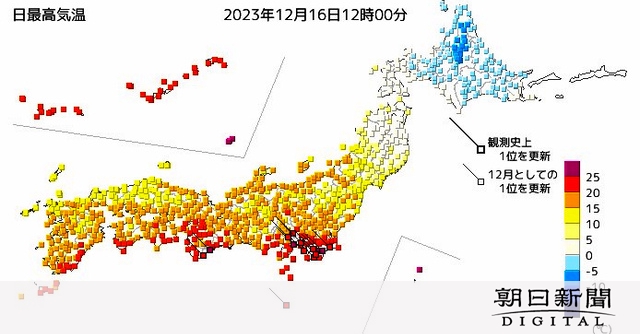 南から暖かい空気が流れ込んだ影響で、16日は15日夜に引き続き、各地で気温が上がった。気象庁によると、16日午後1時20分時点で、全国17地点で最高気温が12月の観測史上最高を更新した。