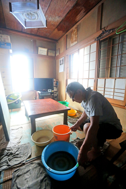 「昨日電気が通ったと思ったのに、今度はこの雨だ」。築50年の2階建て住宅に住む男性(69)は嘆きながら、雨粒のしたたる2階寝室の床を雑巾で拭いた。部屋には雨を受けるためのバケツが七つ並ぶ。
