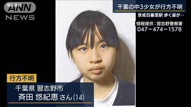 千葉県習志野市の中学3年生の斉田悠紀恵さん(14)が、今月10日に自宅を出たまま、行方がわからなくなっています。警察によりますと、斉田さんは10日午後5時ごろに、習志野市内の自宅を出た後、連絡が取れなくなっています。その後、午後7時20分ごろ、東京の京成日暮里駅で電車を降りた後、改札を出て、東日暮里方向へ一人で歩く姿が防犯カメラに映っていました。斉田さんは、身長約150センチのやせ形です。