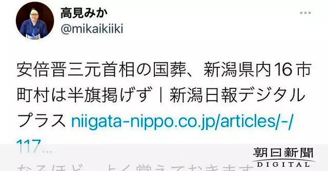 ツイートは国葬が執り行われた27日付。自身のアカウントで、16市町村が半旗を掲げない方針だと報じた地元紙・新潟日報の記事を引用する形で行われた。