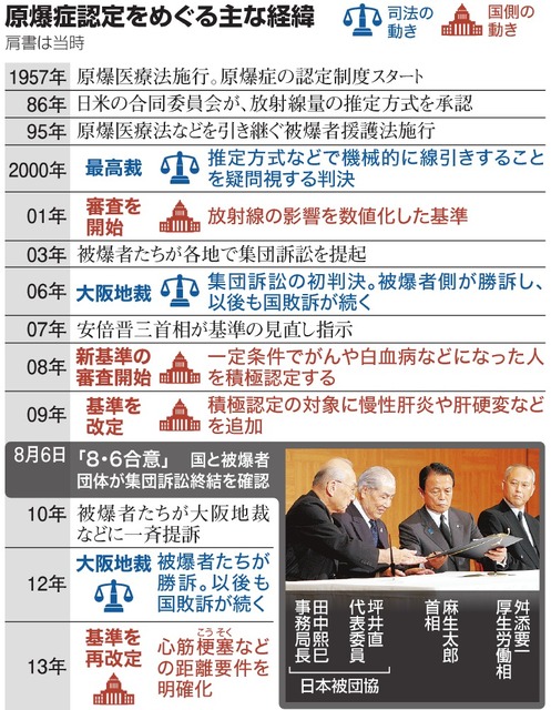 かつての原爆症の認定率は全被爆者の1%足らず。被爆者はこれを不服として集団訴訟を起こし、9割超が勝訴した。こうした状況の中、麻生太郎首相(当時)は被爆者の高齢化や訴訟の長期化を踏まえ、「早期に救済する新たな方針を決断した」と表明。ちょうど10年前、同じホテルで日本原水爆被害者団体協議会(日本被団協)の坪井直(すなお)代表委員(94)らと握手を交わした。これが「8・6合意」だった。