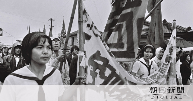沖縄が日本に復帰した1972年5月15日、那覇市中心部に数千人の県民が集まり、復帰に反対するデモ行進をした。機動隊員が警戒する物々しい雰囲気の中、横断幕を手に堂々と歩く女子高校生がいた。手前の高校生は、大きな黒い瞳で真っすぐ前を見つめている。