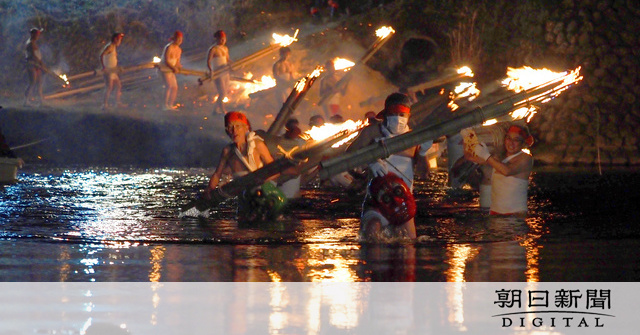 大分県宇佐市の駅館(やっかん)川周辺で4日夜、新年恒例の火祭り「鷹栖観音鬼会(おにえ)」があった。1300年の歴史がある伝統行事だが、コロナ禍で昨年は中止され、2年ぶりの開催。締め込み姿の男たちがたいまつを手に冷たい川を渡り、火の乱舞を繰り広げた。