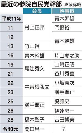 主要3派は参院選前、選挙後の新体制について、岸田派の金子原二郎予算委員長を参院会長に擁立し、世耕氏が幹事長に就く方向で固まりつつあった。しかし、「関口会長」が急転直下決まった。背景には、引退後の今も参院に影響力を持つ竹下派の青木幹雄元参院議員会長の意向がある。