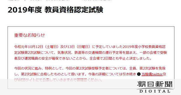 大学での教職課程を修了していない社会人が主に受験する「小学校教員資格認定試験」をめぐり、今月12、13日に予定されていた2次試験が、台風19号の影響で中止になった。文部科学省と事務を担う教職員支援機構は、2次試験に代わる追加の評価法を検討中だ。しかし、機構が11日に2次試験のすべての受験予定者を「合格扱い」にすると発表したため、SNSなどで「なぜ延期じゃなくて合格?」などと話題になっている。