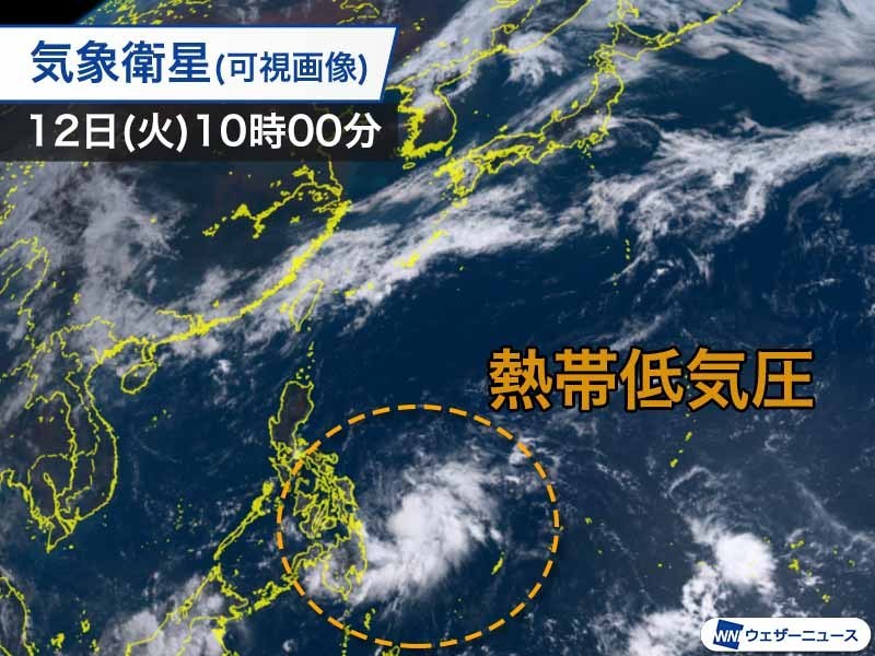 フィリピンの東海上にある熱帯低気圧の雲が徐々にまとまってきました。今夜から明日朝には台風まで発達する見込みです。