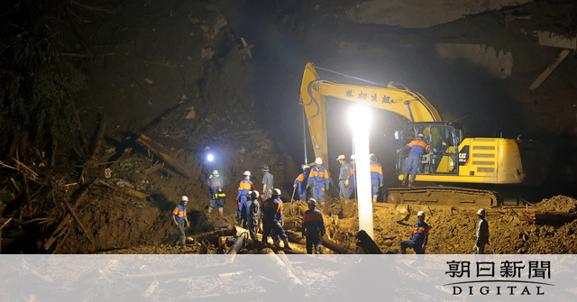 4人が安否不明になっている宮崎県椎葉(しいば)村(そん)の土砂崩れ現場では8日、県警などによる捜索活動が続いた。視察した国土交通省国土技術政策総合研究所の研究者によると、土砂崩れは長さ約200メートル、幅20~40メートルに及び、土砂のほとんどが現場沿いの川に流出。斜面上部に水がたまり、崩落につながったという。