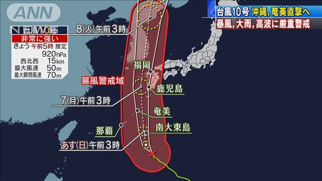 台風10号は6日にかけて沖縄や奄美地方を直撃する見込みです。その後、特別警報級の強さを保ったまま九州に接近、上陸の恐れがあります。 台風は現在、南大東島の南南東、約300キロの海上を西北西に進んでいます。6日にかけて猛烈な勢力で沖縄本島や奄美大島に接近する予想です。その後も北上を続け、7日にかけて特別警報級の強さを保ったまま九州に接近、上陸の恐れが出てきています。最も影響が早く出ている沖縄の大東島地方では、すでに最大瞬間風速が20メートルを超えています。6日にかけて予想される最大瞬間風速は沖縄、奄美で80メートルと記録的な暴風となる見込みです。7日は九州に特別警報級の勢力で接近、上陸の恐れがあり、九州でも瞬間的に70メートルの暴風が予想されています。大雨、暴風、高波に厳重な警戒が必要です。