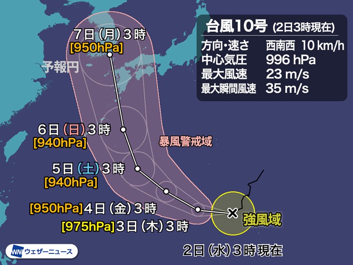 9月2日(水)3時現在、台風10号(ハイシェン)は小笠原近海を西寄りに進みながら発達中です。 記録的に暖かい海水温の影響で猛発達し、近年にない勢力で日本列島に接近・上陸するおそれがあります。最悪のケースを想定して台風への備えを行うようにしてください。 ▼台風10号 9月2日(水)3時