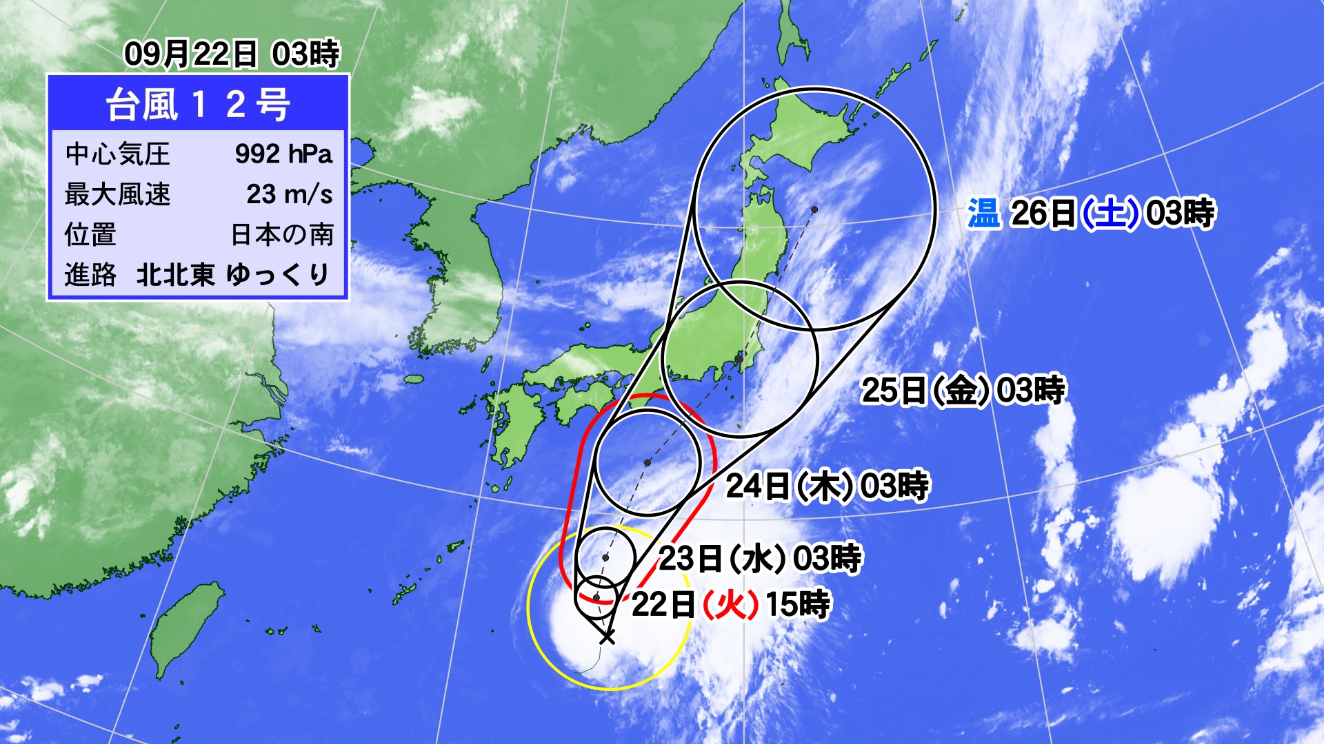 台風12号は、22日午前3時には、日本の南にあってゆっくりした速さで北北東へ進んでいる。中心の気圧は992ヘクトパスカル、中心付近の最大風速は23メートル、最大瞬間風速は35メートルで強風域を伴っている。