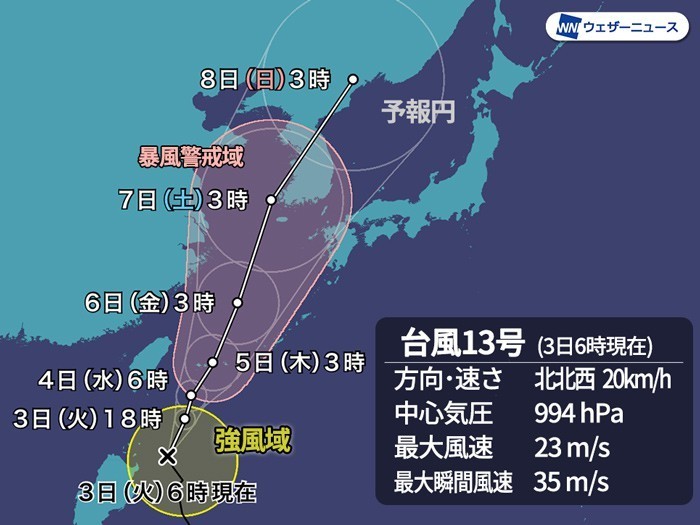 台風13号は、昨日の予想よりもやや早く、沖縄・先島諸島に接近・通過へ変化してきています。