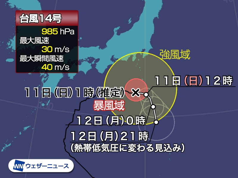 10月11日(日)0時現在、台風14号(チャンホン)は伊豆諸島付近を東に進んでいます。 伊豆諸島の三宅村・御蔵島村に発表されていた大雨特別警報は警報に切り替えられましたが、今後も新たな土砂災害が発生するおそれがあるため、引き続き安全な場所に留まるようにしてください。 三宅島坪田では降り始めから今日0時までの総雨量が597.0mmとなっています。 ▼台風14号 110月11日(日)0時